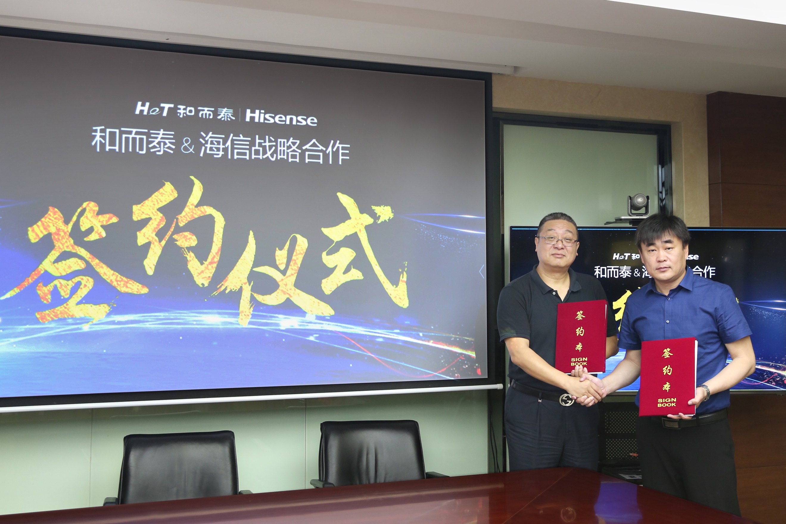 △和而泰副總裁王宏(左一)、海信智慧家居副總經(jīng)理王勇進(jìn)(右一)完成簽約
